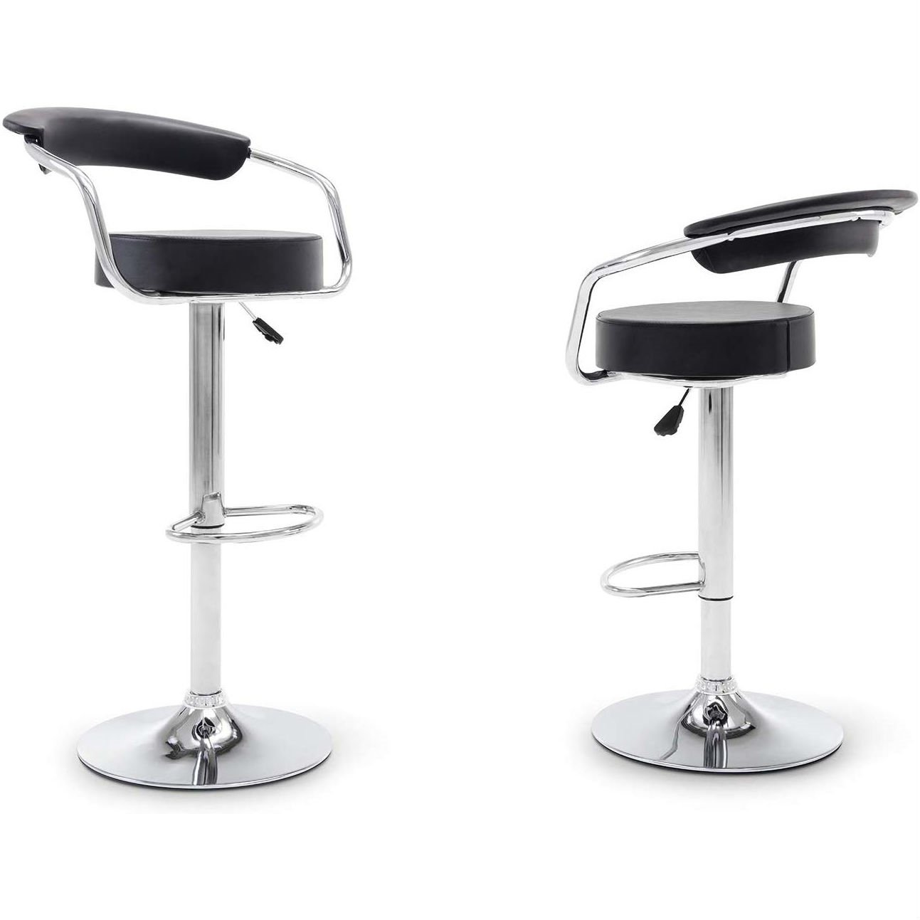 Add a modern and chic touch to any room or entertainment space with this Set of 2 eye-catching swivel barstools. Black Faux Leather Round Seat. Each barstool has a Chrome Footrest.
